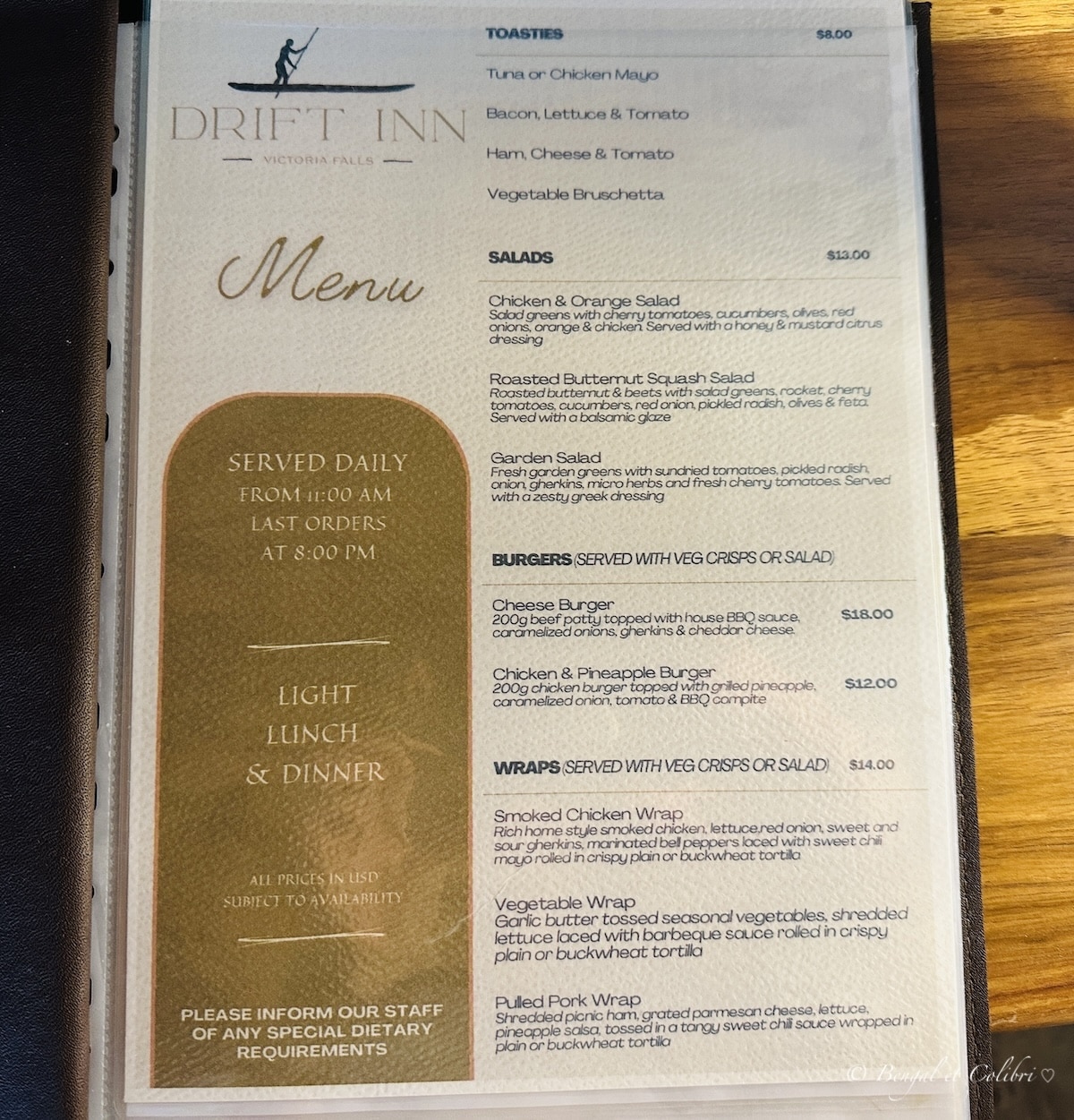 L’endroit est sublime, et nous avons très bien mangé : 1 soupe chaude aux champignons + 1 smoked tilapia + 1 quail veronique + 1 zambezi bream + 1 crème brûlée + 2 verres de vin blanc = pour un total de 76$