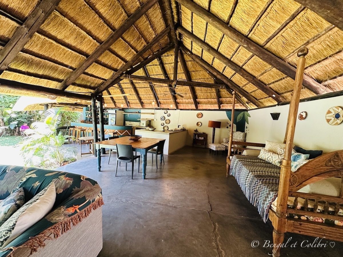 On peut trouver une grande piscine, un très beau jardin, un salon commun, une terrasse et un bar.