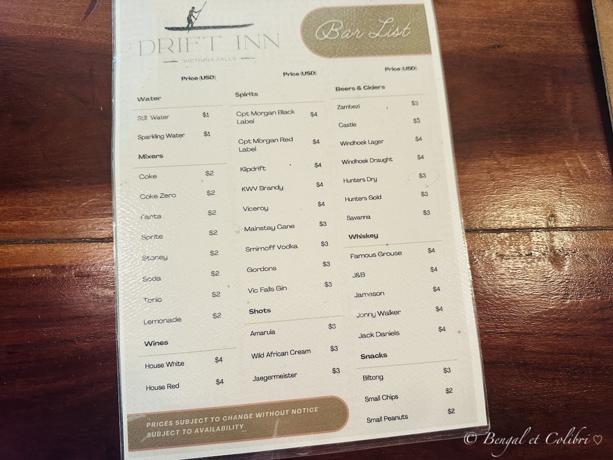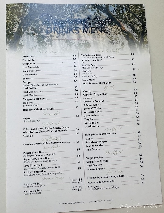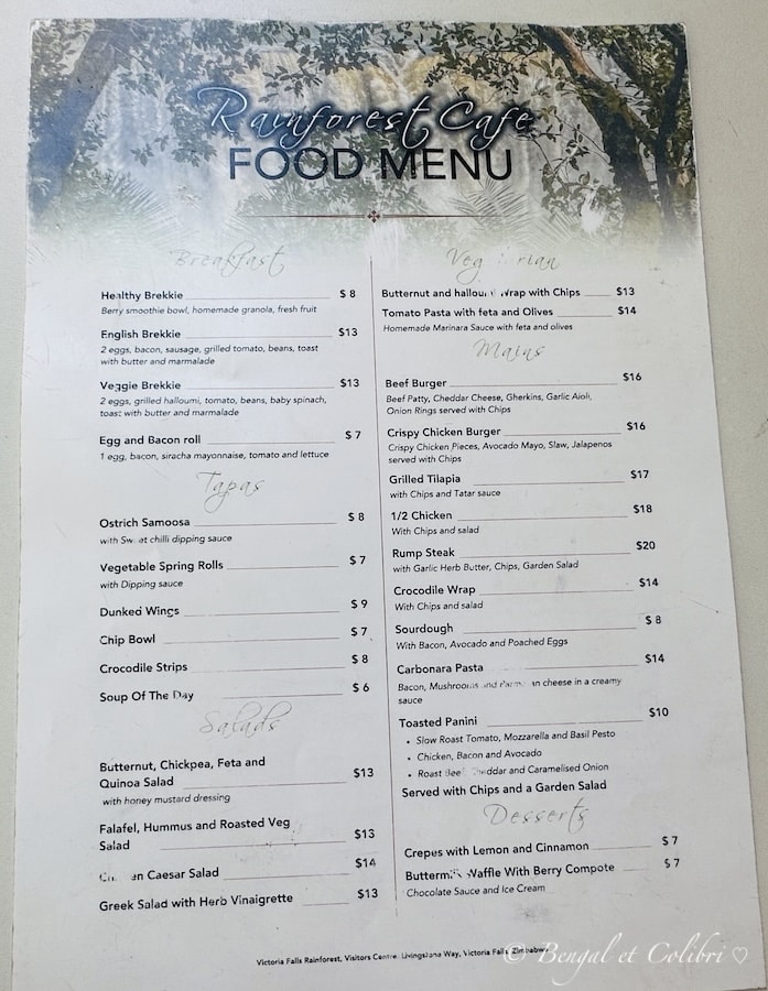 Le prix d’entrée du Parc est de 50$ par personne au Zimbabwe (et de 20$ par personne en Zambie, côté qui permet d’accéder au célèbre mais dangereux Devil’s Pool…nous ne l’avons pas fait 😨 ).