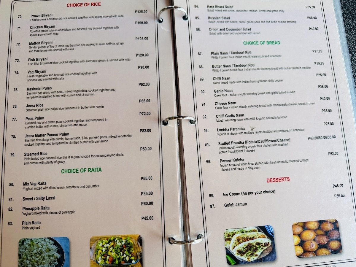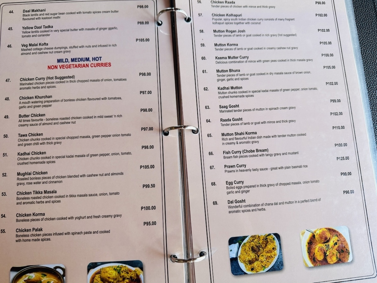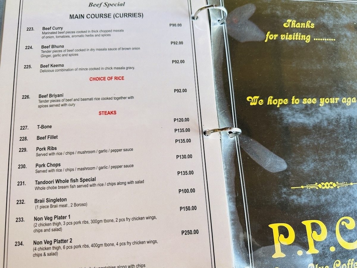 Nous avons pris : 1 chicken curry + 1 veg biryani + 1 verre de vin blanc + 1 bière + 2 petites bouteilles d’eau. Au total 369,49BWP soit environ 22€.