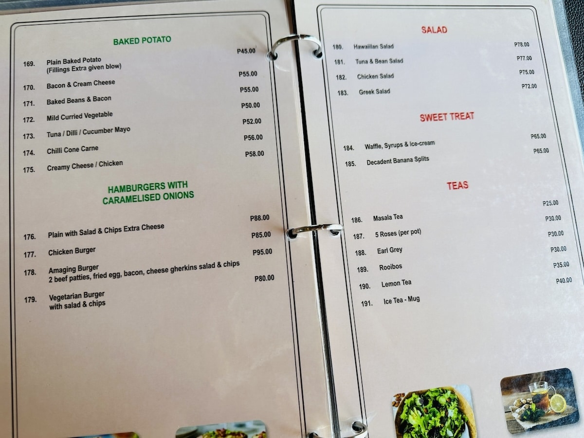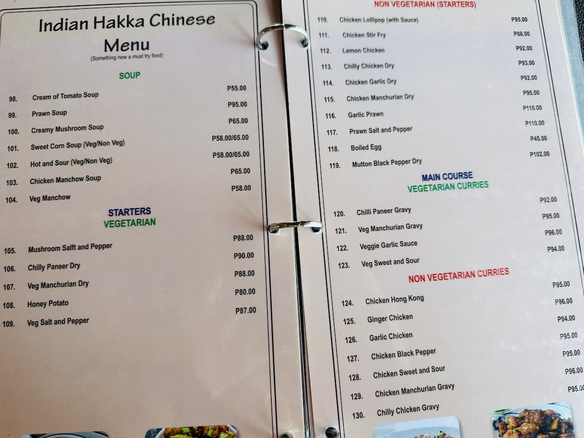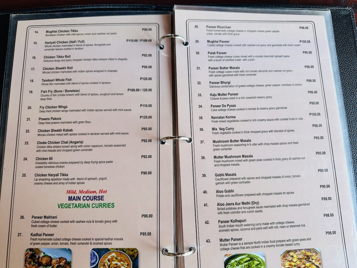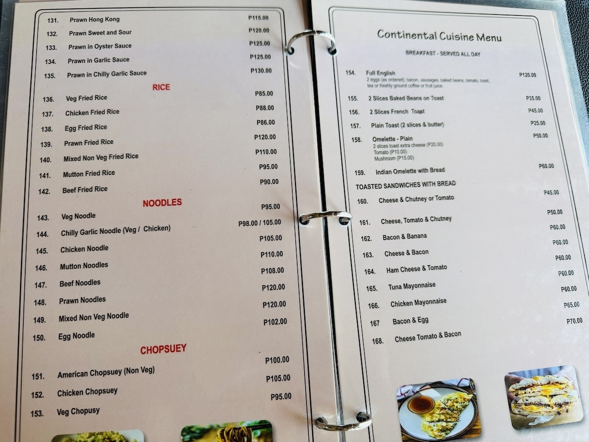 Nous avons pris : 1 chicken curry + 1 veg biryani + 1 verre de vin blanc + 1 bière + 2 petites bouteilles d’eau. Au total 369,49BWP soit environ 22€.