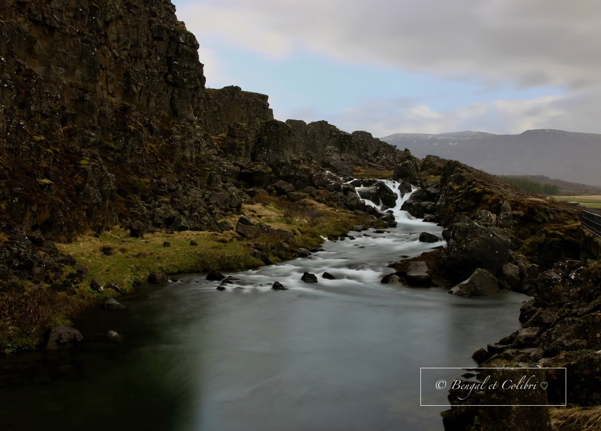 Le Parc est donc rempli de fissures. En partant depuis le parking P1, on commence par la faille d’Almannagjá (qui veut dire « faille de tous les hommes »), zone de rift c’est à dire une sorte de fossé d’effondrement. La faille forme un véritable canyon, long de 7,7km et de 40m de haut par endroits. Il s’agit d’une des plus grandes fissures d’Islande.